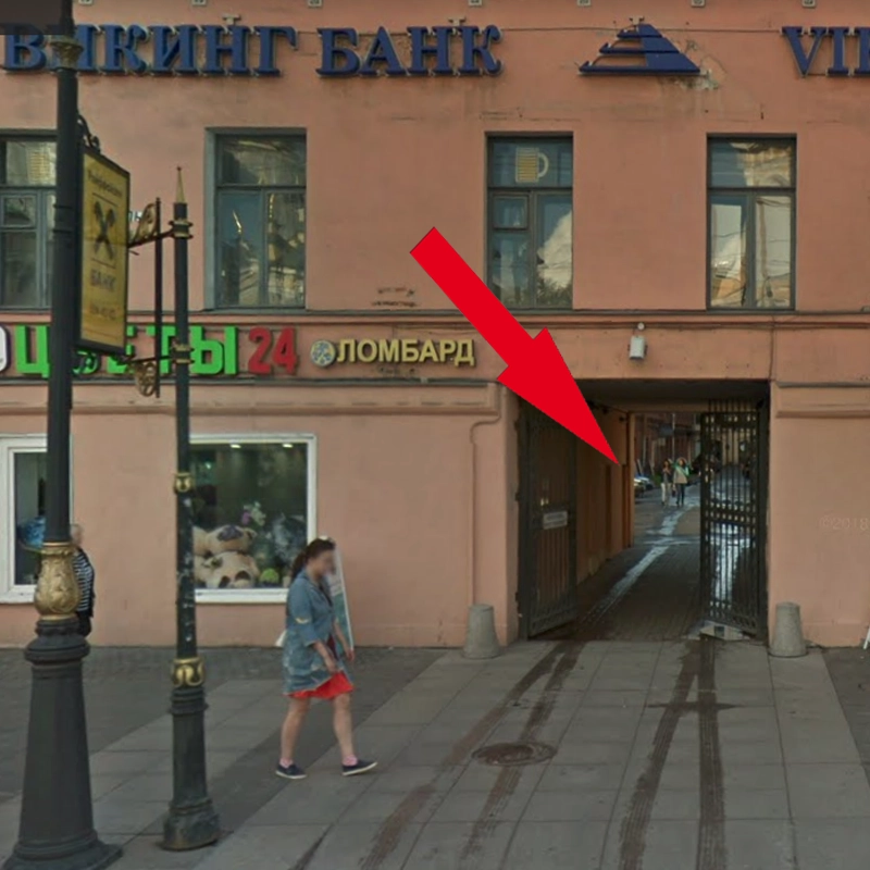 | Вход под арку со стороны Владимирского проспекта. Пройдя под арку пройдите прямо примерно 20 метров и поверните направо к крыльцу, 1-й корпус, вход в бизнес-центр. Поднявшись на лифте на 4-й этаж идите налево до офиса 423. | |